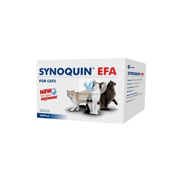 Acción: SYNOQUIN® EFA GATO es un complemento dietético condroprotector indicado en situaciones en las que el uso y el desgaste natural de las articulaciones ha provocado una reducción en el rendimiento normal de las mismas.