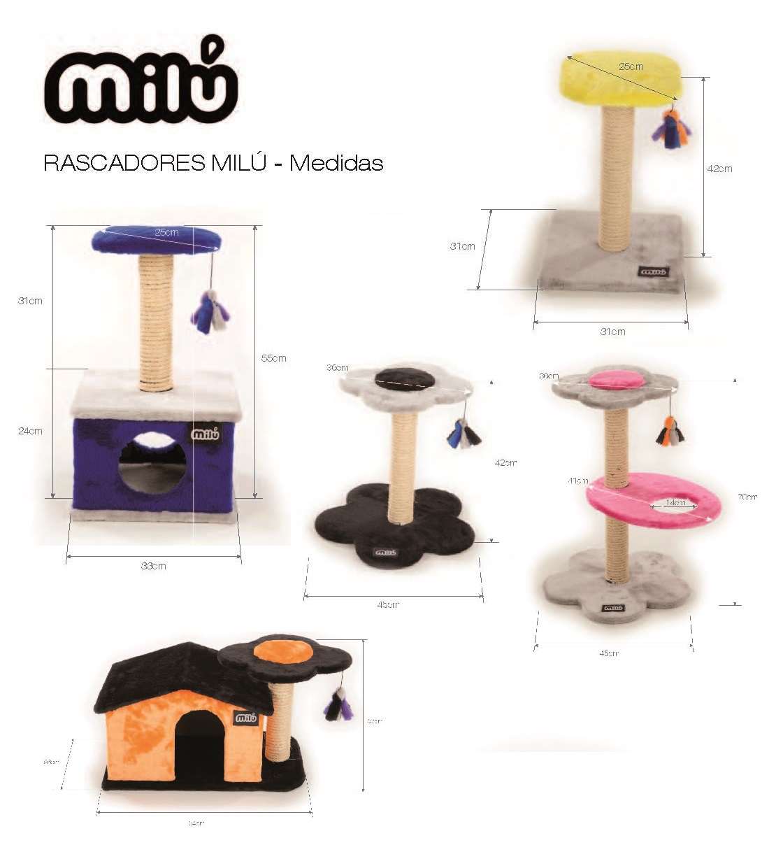 Rascador para gatos con cueva en la parte inferior y un poste vertical con DOS bases.