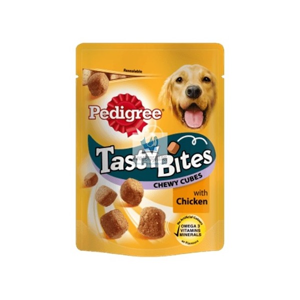 Pedigree Tasty Bites Chewy Cubes es un snack delicioso para perros, con un sabor a pollo que cautivará el paladar de tu mascota.